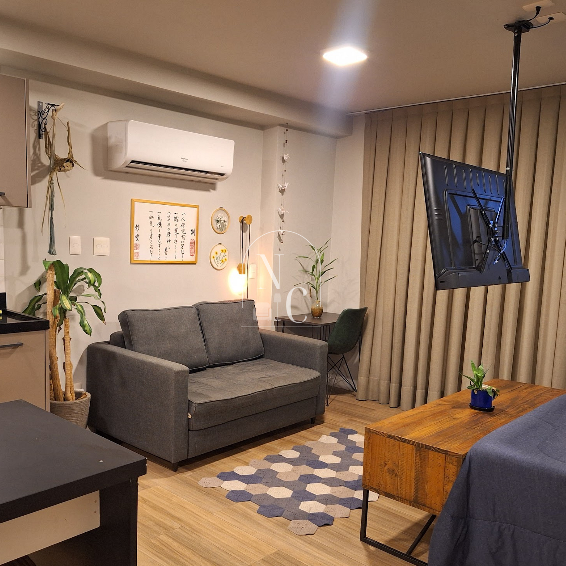 No apartamento 704 você irá encontrar uma cama de casal, edredom, travesseiros e cobertas extras, um sofá , TV, armário com cabides para guardar as roupasuma mesa alta de jantar para 2 pessoas, utensílios para cozinhar, fogão a indução, geladeira.