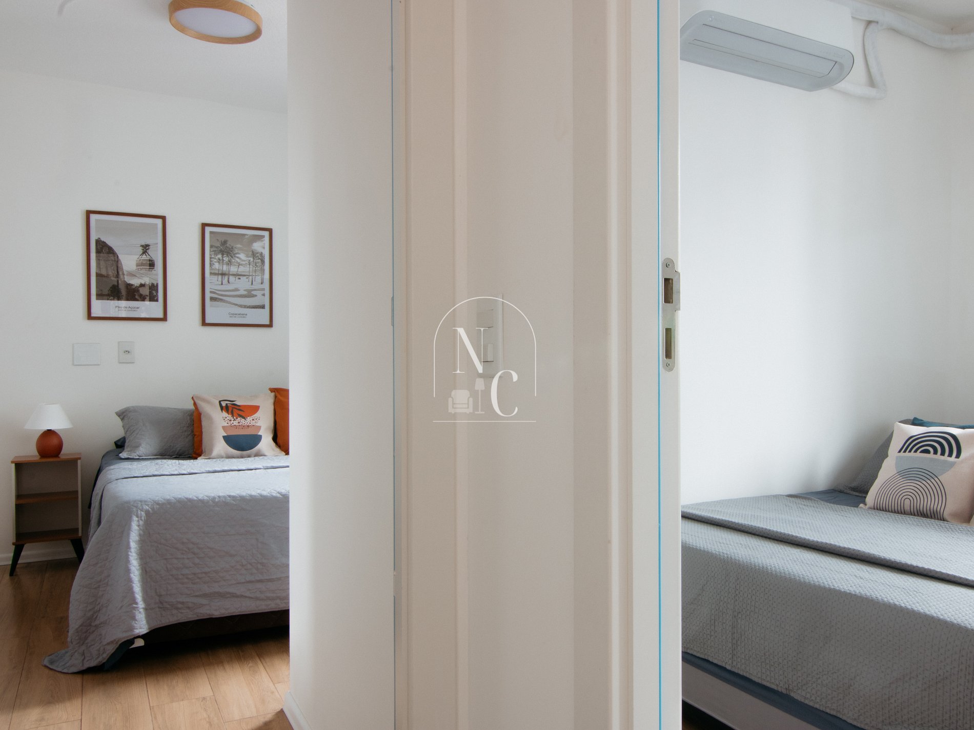 Nosso apartamento possui dois quartos (ambos com camas de casal), cozinha equipada, sala de estar com mesa de jantar e banheiro.
