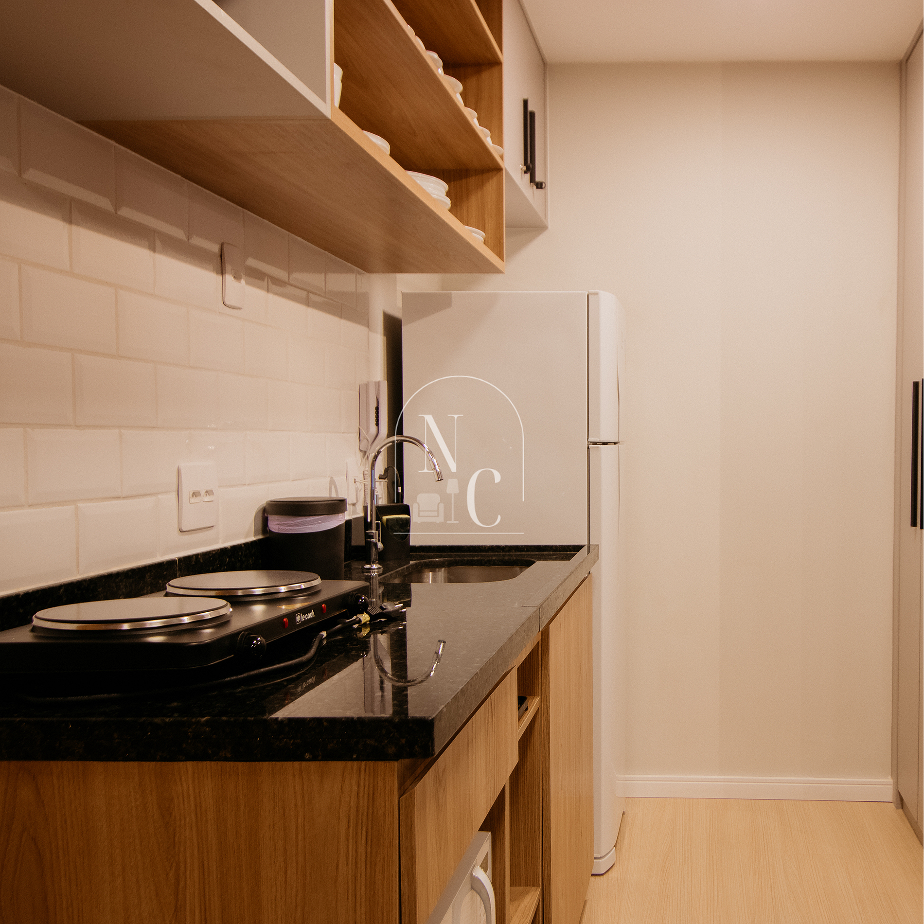 Cozinha equipada com fogão, micro-ondas, geladeira e utensílios