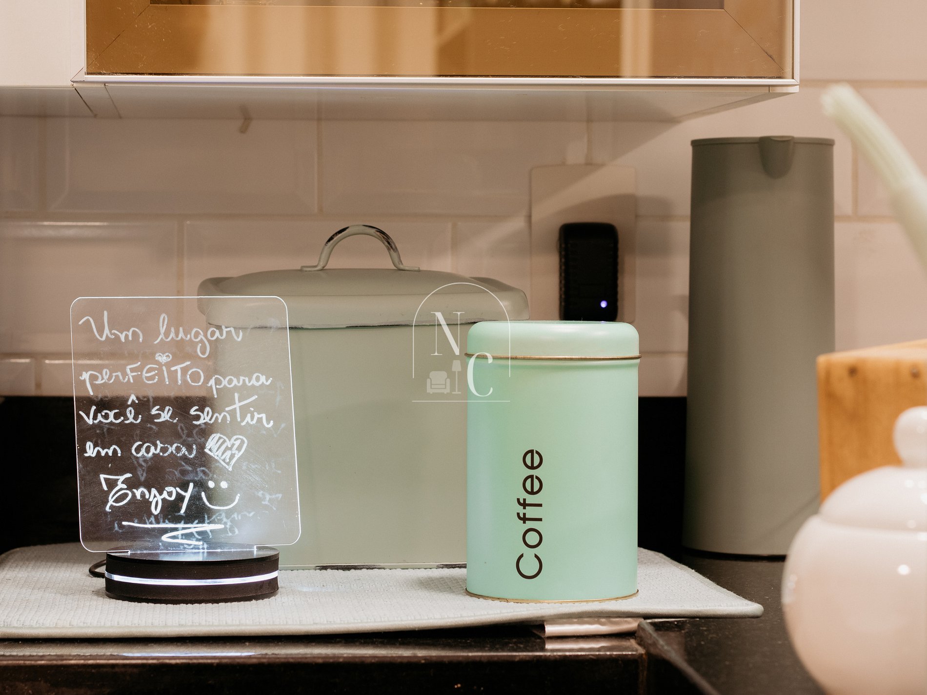 Deixamos um enxoval na cozinha com panelas, copos, taças, talheres, xícaras, jogo americano, dentre outras comodidades para que você possa preparar sua própria refeição, porque acreditamos que cozinhar é uma forma de amar a si mesmo e o outro.