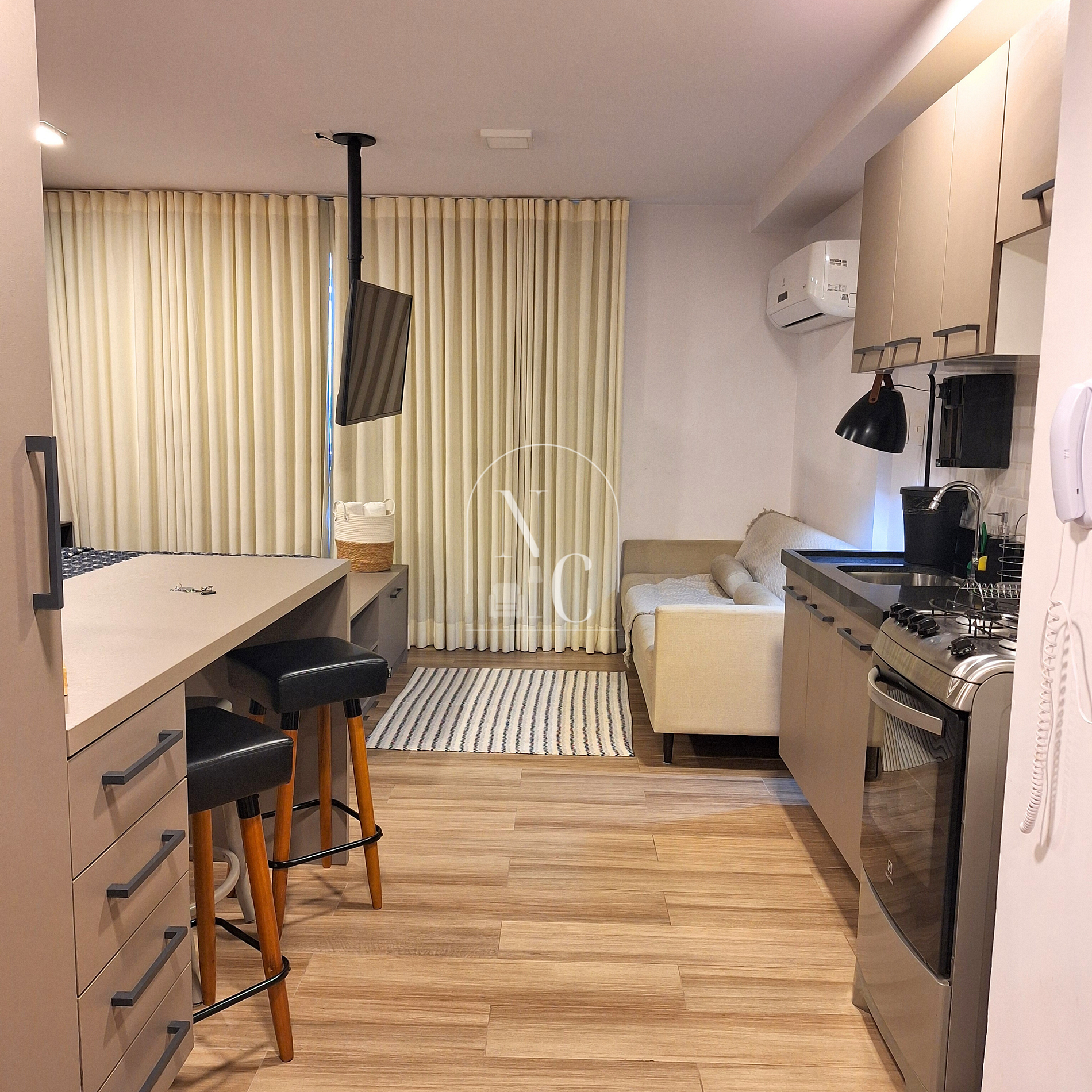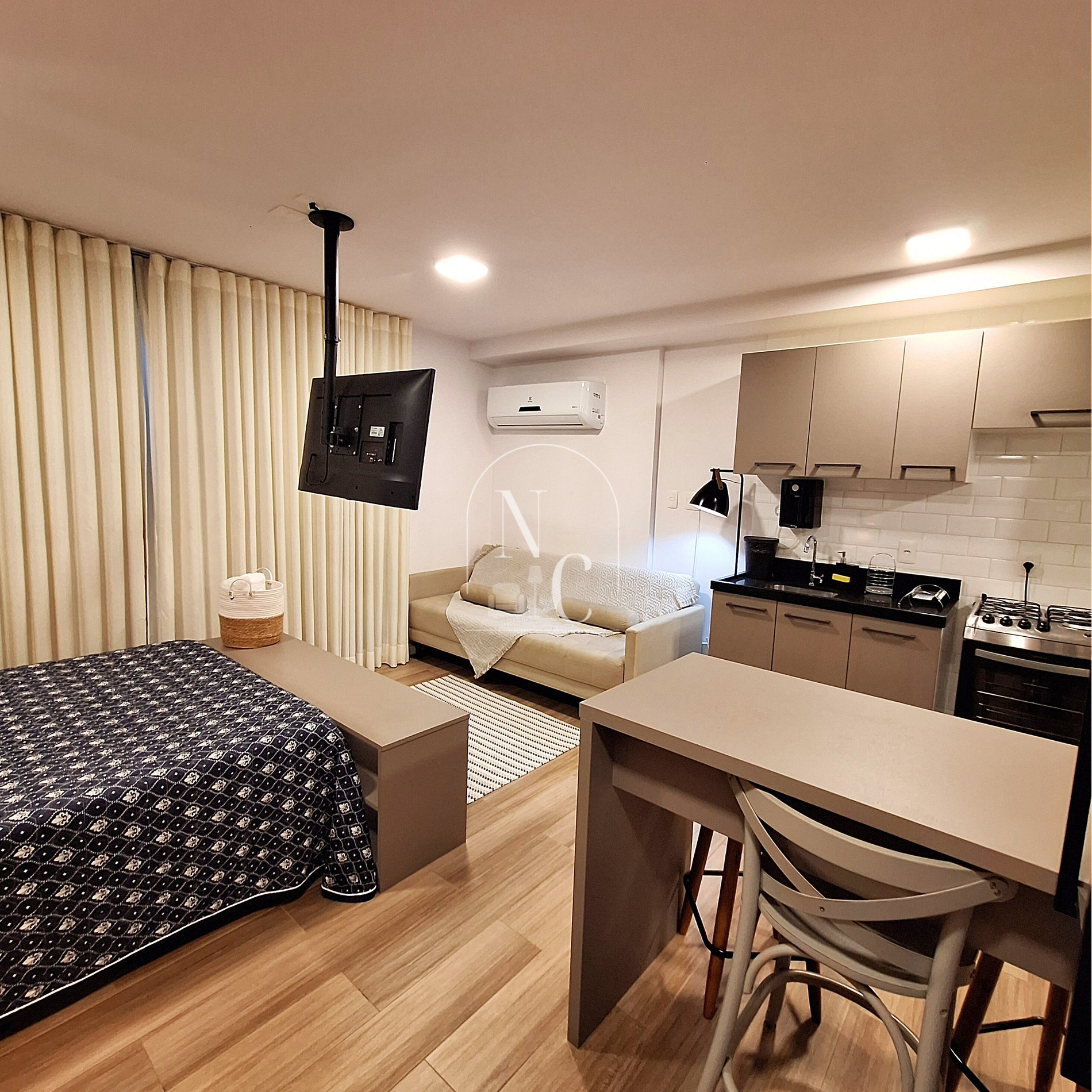 No apartamento 501você irá encontrar uma cama de casal, edredom, travesseiros e cobertas extras, um sofá cama, TV, armário com cabides para guardar as roupasuma mesa alta de jantar para 3 pessoas, utensílios para cozinhar, fogão a gás, geladeira.