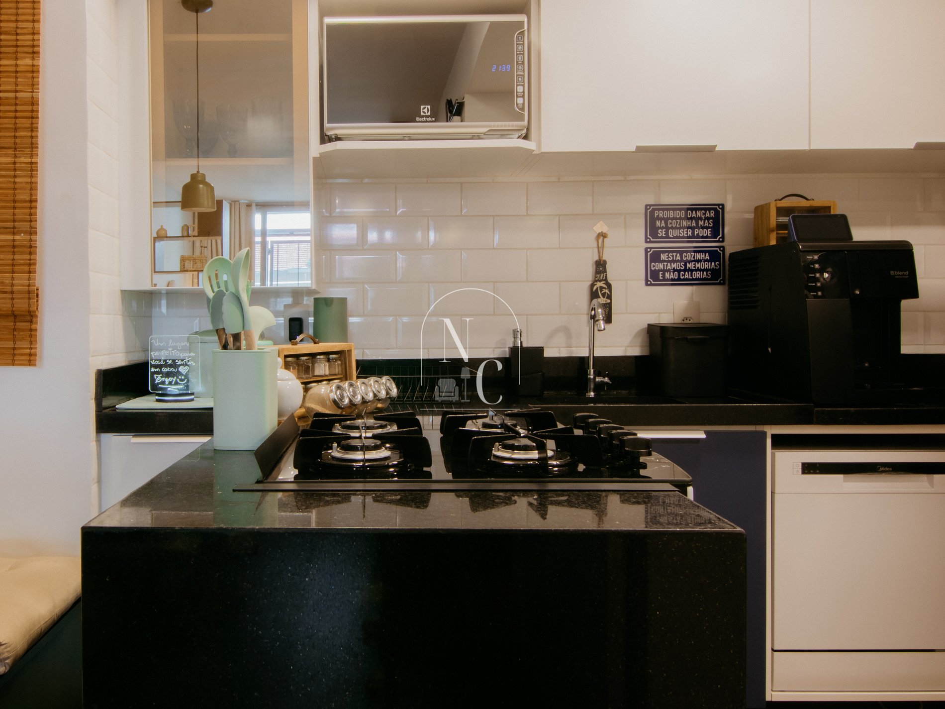 Deixamos um enxoval na cozinha com panelas, copos, taças, talheres, xícaras, jogo americano, dentre outras comodidades para que você possa preparar sua própria refeição, porque acreditamos que cozinhar é uma forma de amar a si mesmo e o outro.