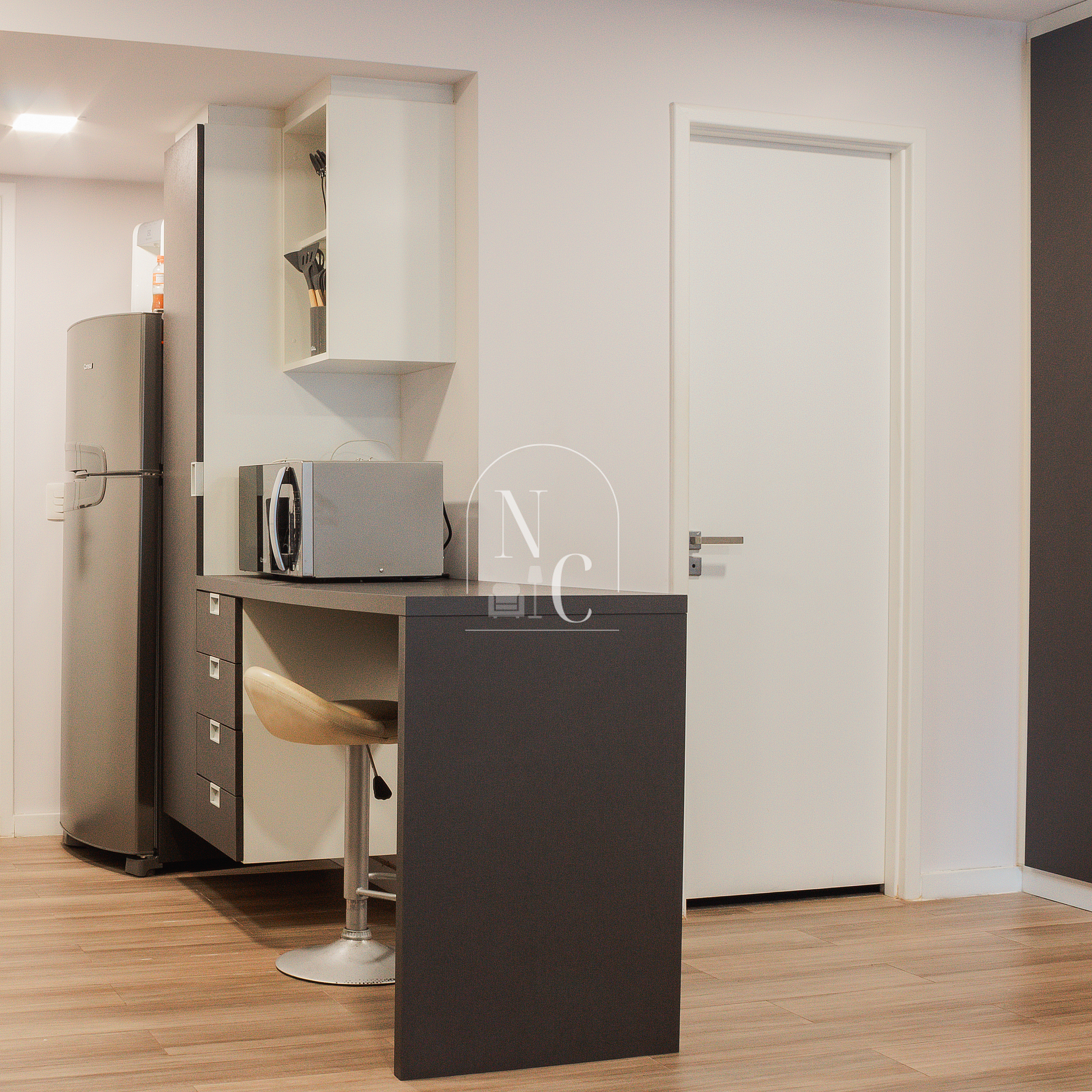 Cozinha compacta com cooktop, geladeira, micro-ondas e utensílios