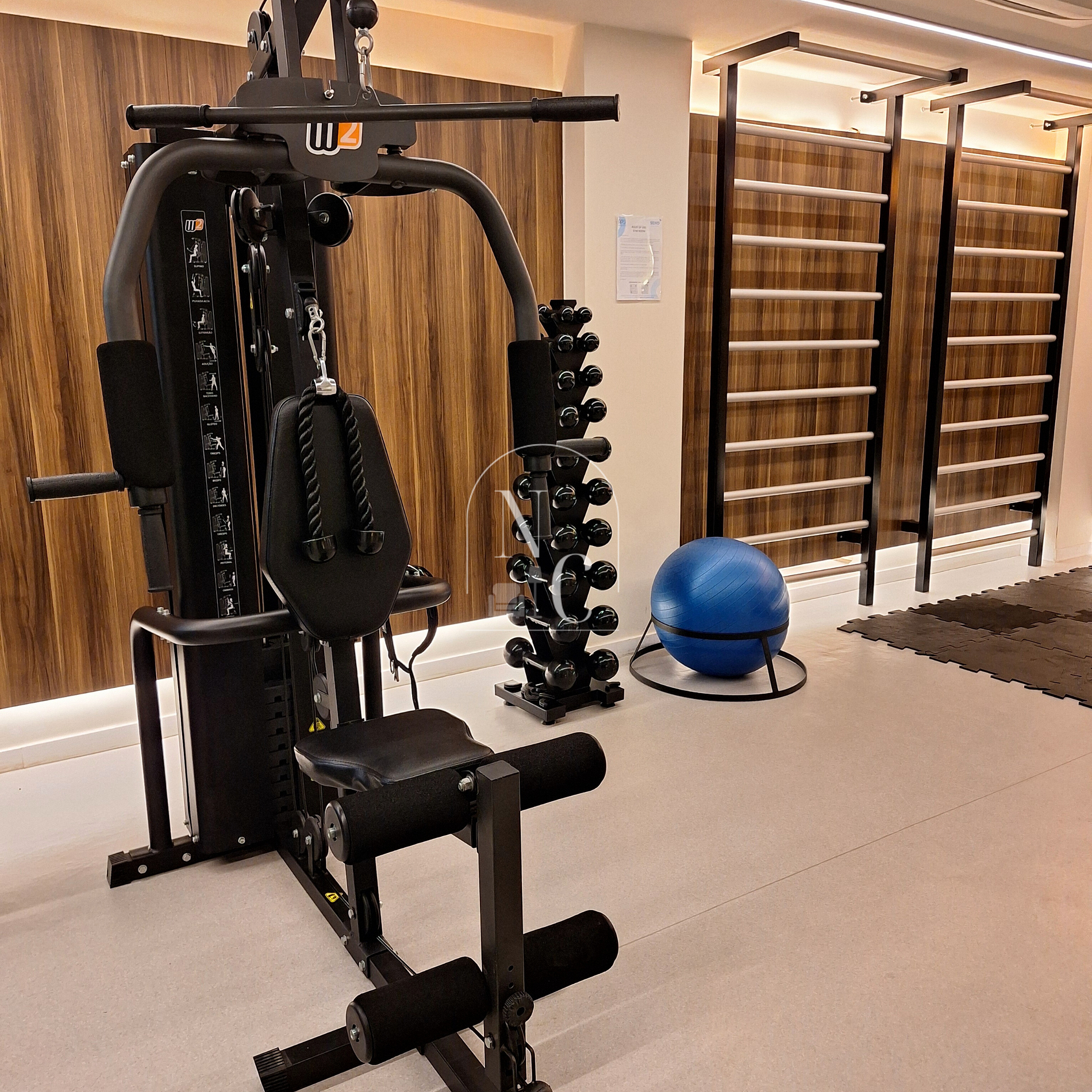 Academia com esteiras, bicicleta ergométrica, pesos livres e aparelho de musculação